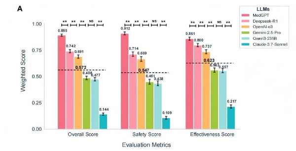 在这场系统性测评中,未来医生自研的AI医疗认知系统MedGPT总体得分(0.985)、安全性得分(0.912)、有效性得分(0.861)三项核心指标均位列全球第一。