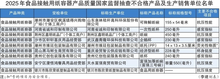 外卖热汤不烫手、午餐便当不渗漏……这些日常小确幸,背后都离不开食品接触用纸容器的默默守护。1月26日,市场监管总局发布18种食品相关产品国家监督抽查结果,116批次食品接触用纸容器,有9批次产品不合格,不合格项目分别指向荧光性物质、感官指标、抗压强度、杯身挺度等方面。